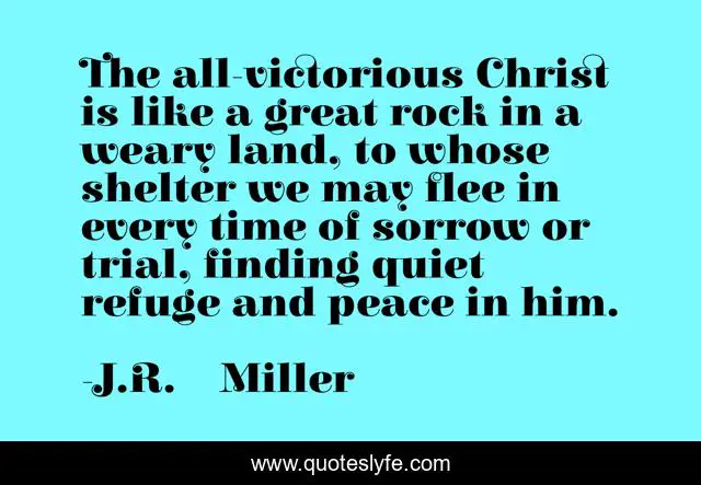 This page presents the quote "The all-victorious Christ is like a great rock in a weary land, to whose shelter we may flee in every time of sorrow or trial, finding quiet refuge and peace in him.". Author of this quote is J.R. Miller. This quote is about christ, sorrow, peace, trial, rock, refuge,.
