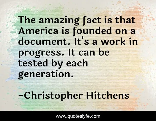 This page presents the quote "The amazing fact is that America is founded on a document. It's a work in progress. It can be tested by each generation.". Author of this quote is Christopher Hitchens. This quote is about progress, work, america,.