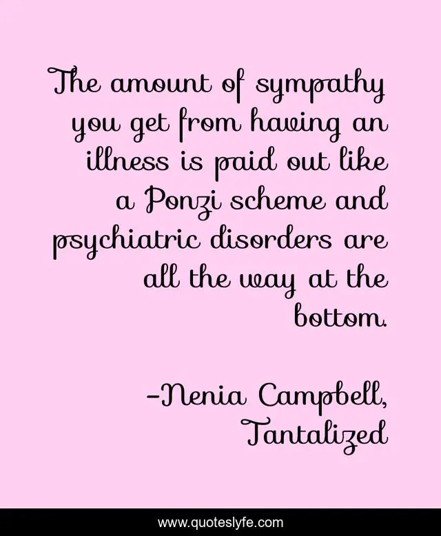 This page presents the quote "The amount of sympathy you get from having an illness is paid out like a Ponzi scheme and psychiatric disorders are all the way at the bottom.". Author of this quote is Nenia Campbell, Tantalized. This quote is about illness, mental-illness,.