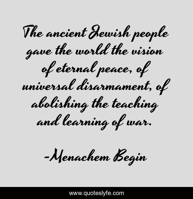 This page presents the quote "The ancient Jewish people gave the world the vision of eternal peace, of universal disarmament, of abolishing the teaching and learning of war.". Author of this quote is Menachem Begin. This quote is about peace, learning, vision,.