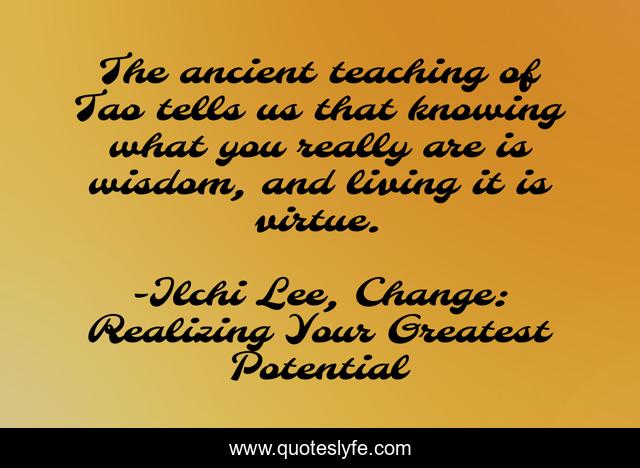This page presents the quote "The ancient teaching of Tao tells us that knowing what you really are is wisdom, and living it is virtue.". Author of this quote is Ilchi Lee, Change: Realizing Your Greatest Potential. This quote is about enthusiasm, inspirational, self-development,.