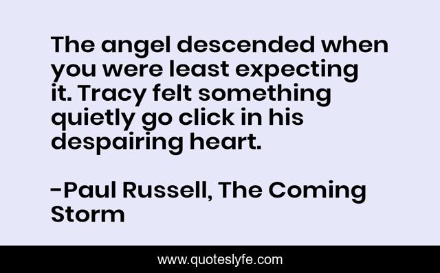 This page presents the quote "The angel descended when you were least expecting it. Tracy felt something quietly go click in his despairing heart.". Author of this quote is Paul Russell, The Coming Storm. This quote is about heart, descended, angel, despairing,.