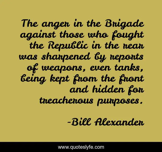 This page presents the quote "The anger in the Brigade against those who fought the Republic in the rear was sharpened by reports of weapons, even tanks, being kept from the front and hidden for treacherous purposes.". Author of this quote is Bill Alexander. This quote is about being, hidden, republic,.