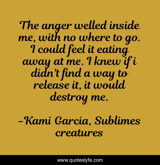 This page presents the quote "The anger welled inside me, with no where to go. I could feel it eating away at me. I knew if i didn't find a way to release it, it would destroy me.". Author of this quote is Kami Garcia, Sublimes creatures. This quote is about helplessness, help, release-the-past, angry, please, anger, release, destroy,.