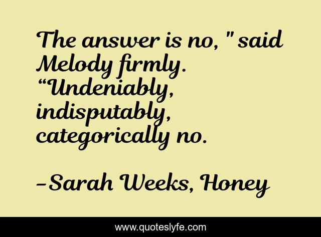 This page presents the quote "The answer is no, " said Melody firmly. “Undeniably, indisputably, categorically no.". Author of this quote is Sarah Weeks, Honey. This quote is about answer, words, no,.