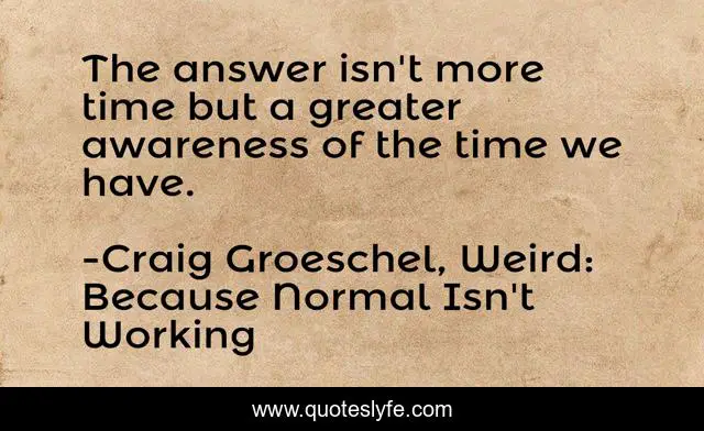 This page presents the quote "The answer isn't more time but a greater awareness of the time we have.". Author of this quote is Craig Groeschel, Weird: Because Normal Isn't Working. This quote is about a, we, greater, of, but, have, time, answer, the,.