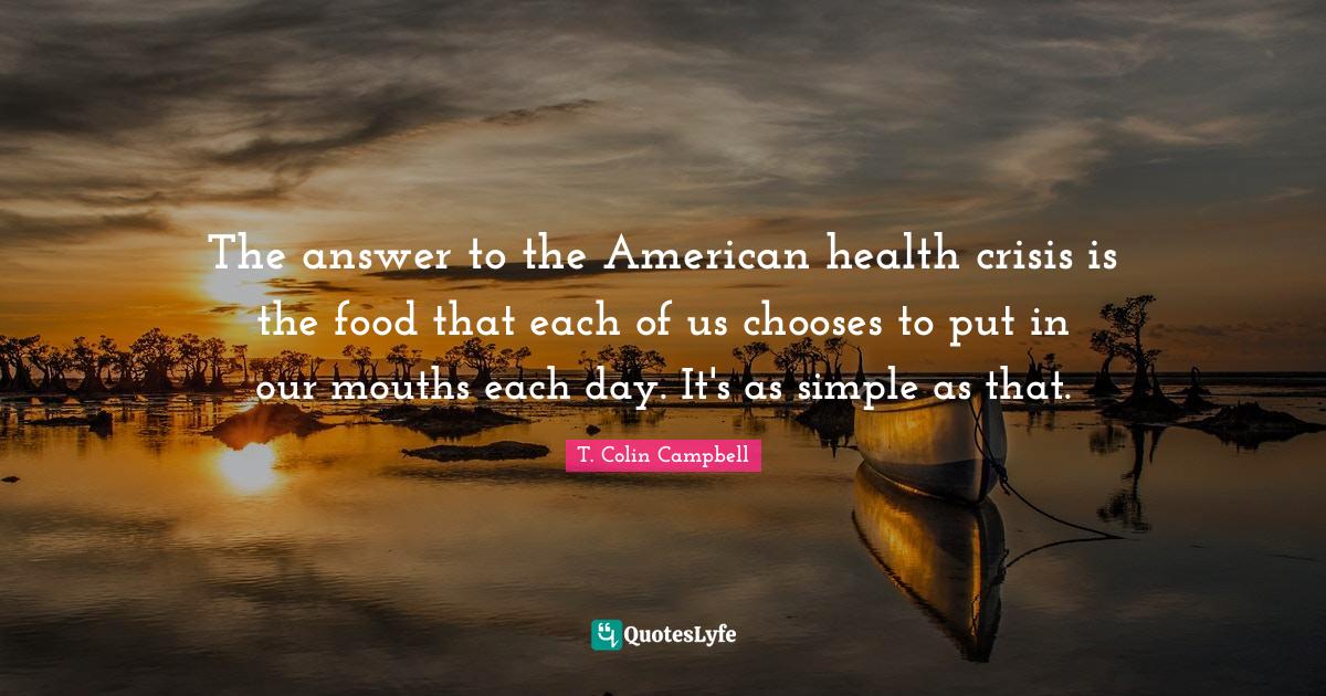 This page presents the quote "The answer to the American health crisis is the food that each of us chooses to put in our mouths each day. It's as simple as that.". Author of this quote is T. Colin Campbell. This quote is about food, each day, answers, health, crisis, mouths, simple,.