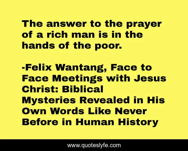 This page presents the quote "The answer to the prayer of a rich man is in the hands of the poor.". Author of this quote is Felix Wantang, Face to Face Meetings with Jesus Christ: Biblical Mysteries Revealed in His Own Words Like Never Before in Human History. This quote is about wantang, hands, felix, rich, prayer, answer, man,.