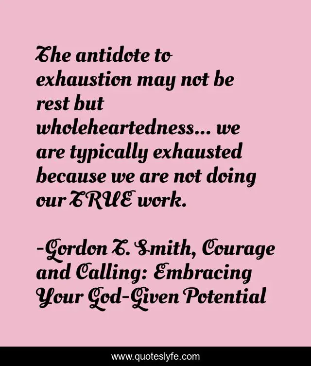 This page presents the quote "The antidote to exhaustion may not be rest but wholeheartedness... we are typically exhausted because we are not doing our TRUE work.". Author of this quote is Gordon T. Smith, Courage and Calling: Embracing Your God-Given Potential. This quote is about passion, exhaustion, rest,.
