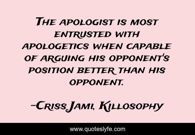 "Criss Jami, Killosophy Quotes." Quoteslyfe.com, 2025. Fri. 05 Dec. 2025. <https://www.quoteslyfe.com/quote/The-apologist-is-most-entrusted-with-apologetics-119810>.