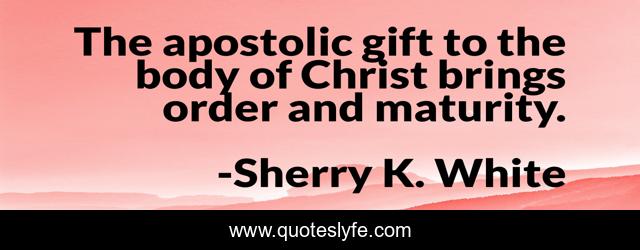 This page presents the quote "The apostolic gift to the body of Christ brings order and maturity.". Author of this quote is Sherry K. White. This quote is about kingdom-of-god, apostle, apostolic-gift, order, maturity,.