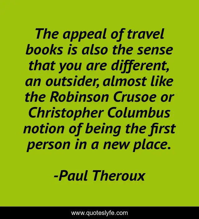 This page presents the quote "The appeal of travel books is also the sense that you are different, an outsider, almost like the Robinson Crusoe or Christopher Columbus notion of being the first person in a new place.". Author of this quote is Paul Theroux. This quote is about new, place,.