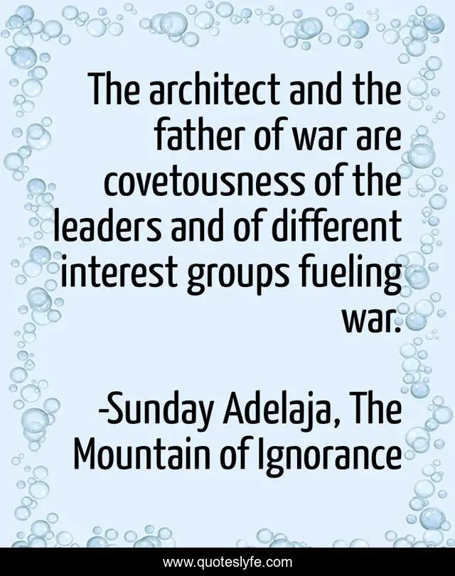 This page presents the quote "The architect and the father of war are covetousness of the leaders and of different interest groups fueling war.". Author of this quote is Sunday Adelaja, The Mountain of Ignorance. This quote is about interest-groups, mountain, life, darkness, power, danger, god, people, ignorance,.