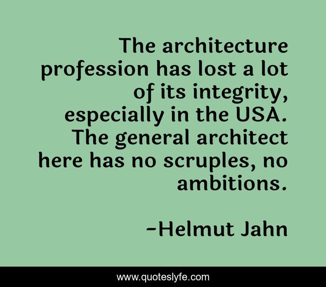 This page presents the quote "The architecture profession has lost a lot of its integrity, especially in the USA. The general architect here has no scruples, no ambitions.". Author of this quote is Helmut Jahn. This quote is about integrity, lost, here,.