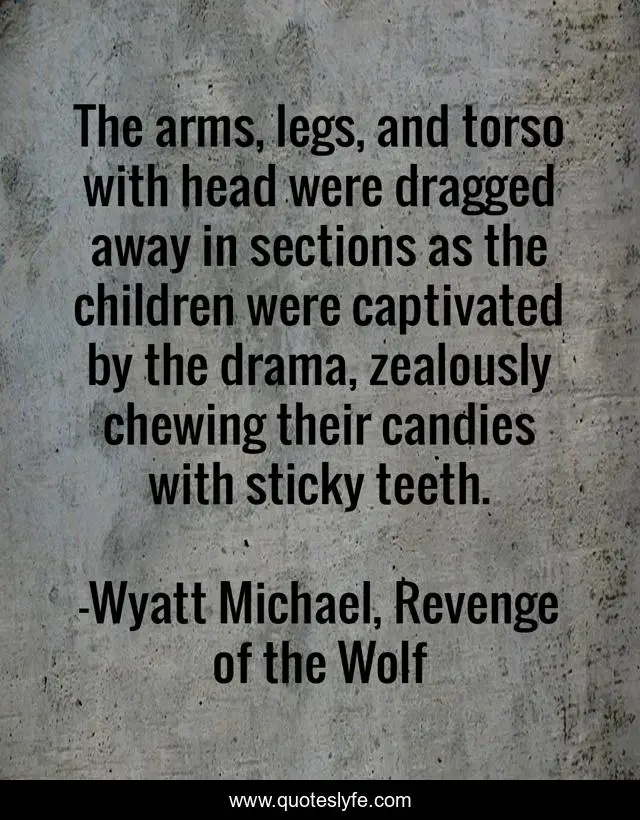 This page presents the quote "The arms, legs, and torso with head were dragged away in sections as the children were captivated by the drama, zealously chewing their candies with sticky teeth.". Author of this quote is Wyatt Michael, Revenge of the Wolf. This quote is about mystery, horror, suspense, paranormal, thriller,.