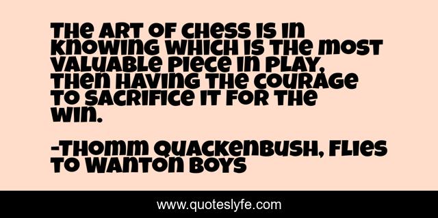 This page presents the quote "The art of chess is in knowing which is the most valuable piece in play, then having the courage to sacrifice it for the win.". Author of this quote is Thomm Quackenbush, Flies to Wanton Boys. This quote is about win, sacrifice, chess, valuable,.