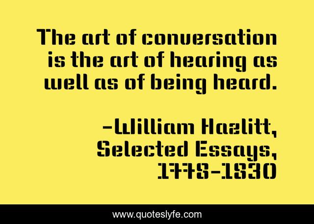 This page presents the quote "The art of conversation is the art of hearing as well as of being heard.". Author of this quote is William Hazlitt, Selected Essays, 1778-1830. This quote is about hearing, conversation, attention, listening, respect,.