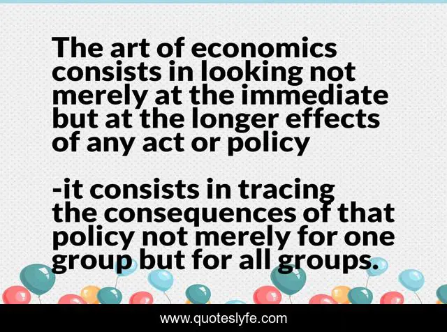 This page presents the quote "The art of economics consists in looking not merely at the immediate but at the longer effects of any act or policy". Author of this quote is it consists in tracing the consequences of that policy not merely for one group but for all groups.. .
