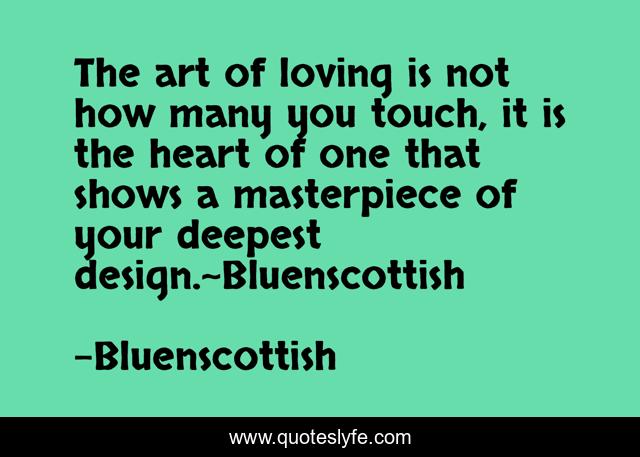This page presents the quote "The art of loving is not how many you touch, it is the heart of one that shows a masterpiece of your deepest design.~Bluenscottish". Author of this quote is Bluenscottish. This quote is about relationships, love, loving, bluenscottish, kindness, affection, inspiration,.