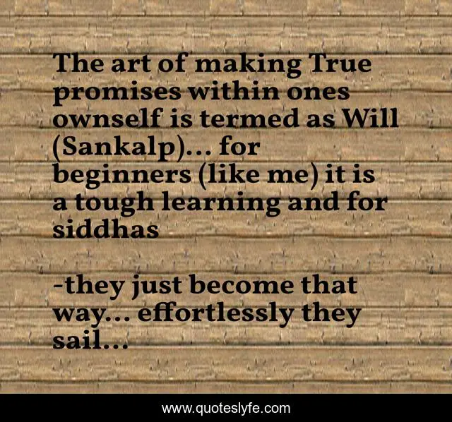 This page presents the quote "The art of making True promises within ones ownself is termed as Will (Sankalp)... for beginners (like me) it is a tough learning and for siddhas". Author of this quote is they just become that way... effortlessly they sail.... This quote is about destiny re scripted, dinesh kumar,.
