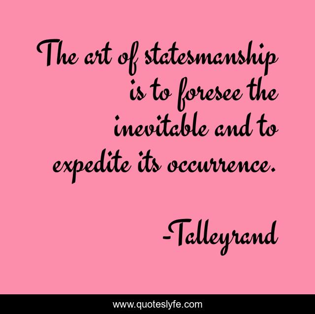 This page presents the quote "The art of statesmanship is to foresee the inevitable and to expedite its occurrence.". Author of this quote is Talleyrand. .