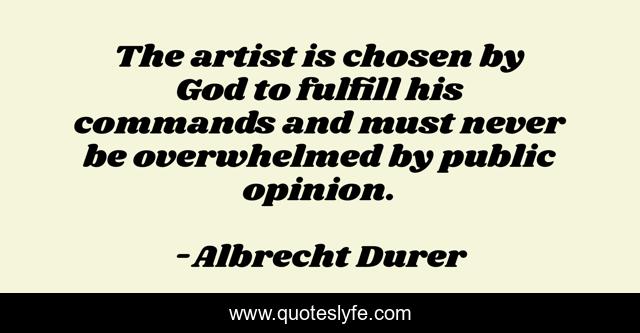 This page presents the quote "The artist is chosen by God to fulfill his commands and must never be overwhelmed by public opinion.". Author of this quote is Albrecht Durer. This quote is about opinion, overwhelmed, artist,.