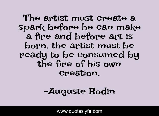 This page presents the quote "The artist must create a spark before he can make a fire and before art is born, the artist must be ready to be consumed by the fire of his own creation.". Author of this quote is Auguste Rodin. This quote is about fire, spark, artist,.