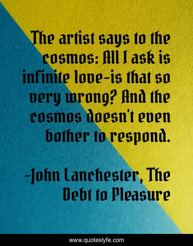 This page presents the quote "The artist says to the cosmos: All I ask is infinite love-is that so very wrong? And the cosmos doesn't even bother to respond.". Author of this quote is John Lanchester, The Debt to Pleasure. .