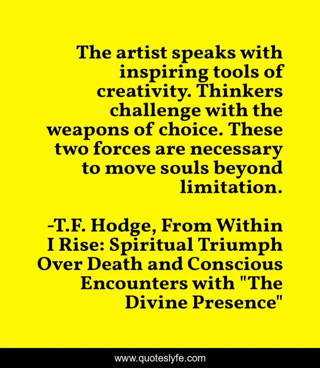 "T.F. Hodge, From Within I Rise: Spiritual Triumph Over Death and Conscious Encounters with "The Divine Presence" Quotes." Quoteslyfe.com, 2025. Sat. 06 Dec. 2025. <https://www.quoteslyfe.com/quote/The-artist-speaks-with-inspiring-tools-of-87492>.