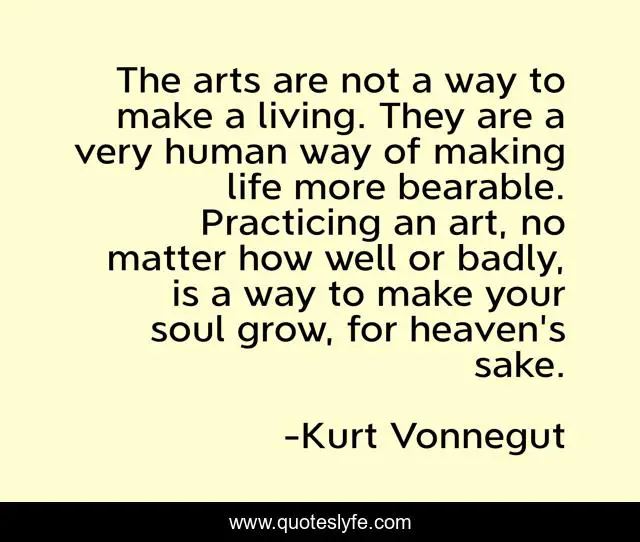 This page presents the quote "The arts are not a way to make a living. They are a very human way of making life more bearable. Practicing an art, no matter how well or badly, is a way to make your soul grow, for heaven's sake.". Author of this quote is Kurt Vonnegut. This quote is about life, soul, grow,.