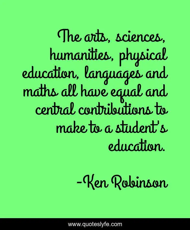 This page presents the quote "The arts, sciences, humanities, physical education, languages and maths all have equal and central contributions to make to a student's education.". Author of this quote is Ken Robinson. This quote is about equal, student, humanities,.