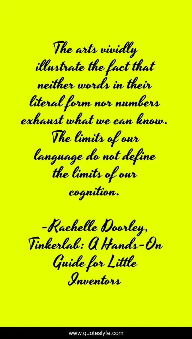 This page presents the quote "The arts vividly illustrate the fact that neither words in their literal form nor numbers exhaust what we can know. The limits of our language do not define the limits of our cognition.". Author of this quote is Rachelle Doorley, Tinkerlab: A Hands-On Guide for Little Inventors. This quote is about arts, language,.