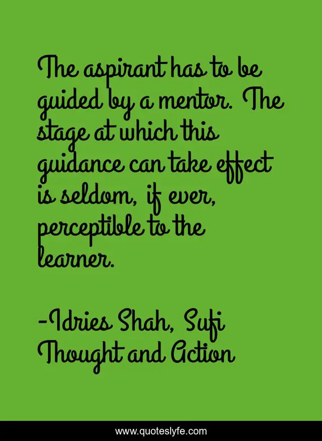 This page presents the quote "The aspirant has to be guided by a mentor. The stage at which this guidance can take effect is seldom, if ever, perceptible to the learner.". Author of this quote is Idries Shah, Sufi Thought and Action. This quote is about sufism, sufis, sufi-way, tasawwuf,.