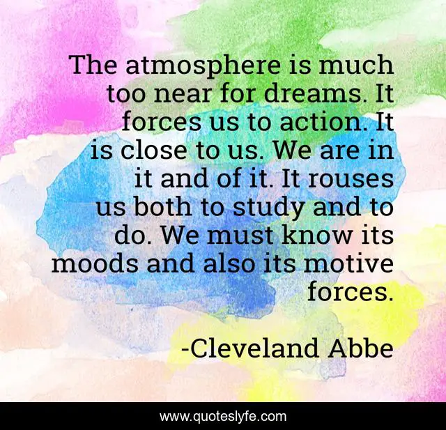 This page presents the quote "The atmosphere is much too near for dreams. It forces us to action. It is close to us. We are in it and of it. It rouses us both to study and to do. We must know its moods and also its motive forces.". Author of this quote is Cleveland Abbe. This quote is about action, study,.