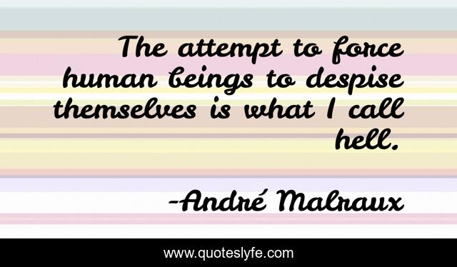 This page presents the quote "The attempt to force human beings to despise themselves is what I call hell.". Author of this quote is André Malraux. This quote is about marketing, fashion-industry, self-hatred, advertising, diet-industry, self-esteem,.