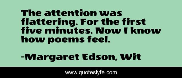 This page presents the quote "The attention was flattering. For the first five minutes. Now I know how poems feel.". Author of this quote is Margaret Edson, Wit. This quote is about poems, attention, poetry, cancer,.
