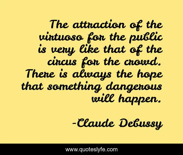 This page presents the quote "The attraction of the virtuoso for the public is very like that of the circus for the crowd. There is always the hope that something dangerous will happen.". Author of this quote is Claude Debussy. This quote is about dangerous, circus, always,.