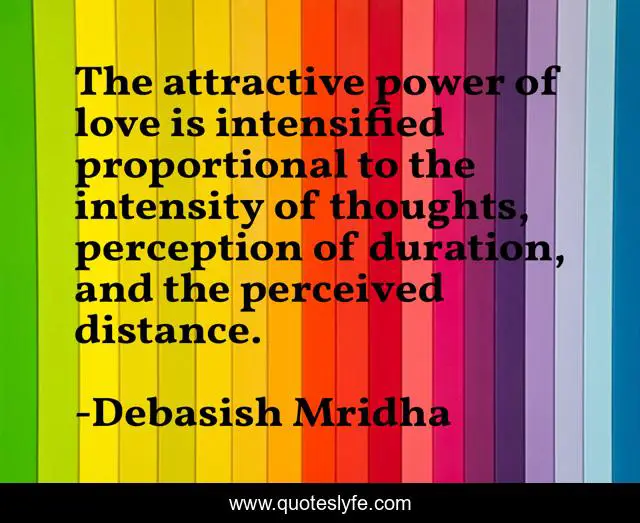 This page presents the quote "The attractive power of love is intensified proportional to the intensity of thoughts, perception of duration, and the perceived distance.". Author of this quote is Debasish Mridha. This quote is about attractive-power-of-love, definition-of-love, philosophy, debasish-mridha, power-of-love, quotes, debasish-mridha-md, inspirational, enthusiasm,.