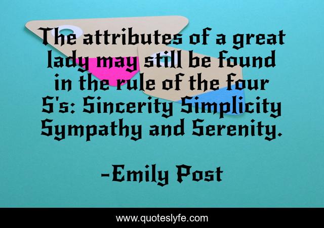 This page presents the quote "The attributes of a great lady may still be found in the rule of the four S's: Sincerity Simplicity Sympathy and Serenity.". Author of this quote is Emily Post. .