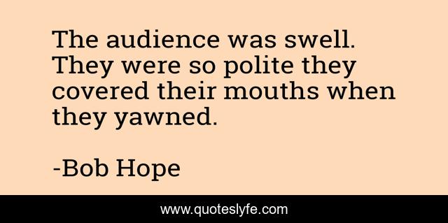 This page presents the quote "The audience was swell. They were so polite they covered their mouths when they yawned.". Author of this quote is Bob Hope. This quote is about yous, thank, closures,.