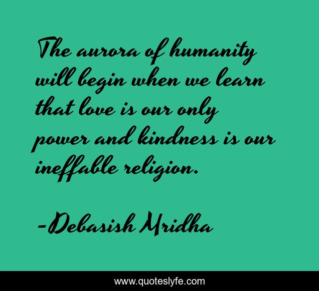 This page presents the quote "The aurora of humanity will begin when we learn that love is our only power and kindness is our ineffable religion.". Author of this quote is Debasish Mridha. This quote is about love-is-our-only-power, philosophy, debasish-mridha, quotes, debasish-mridha-md, inspirational, kindness-is-our-religion, enthusiasm, kindness,.