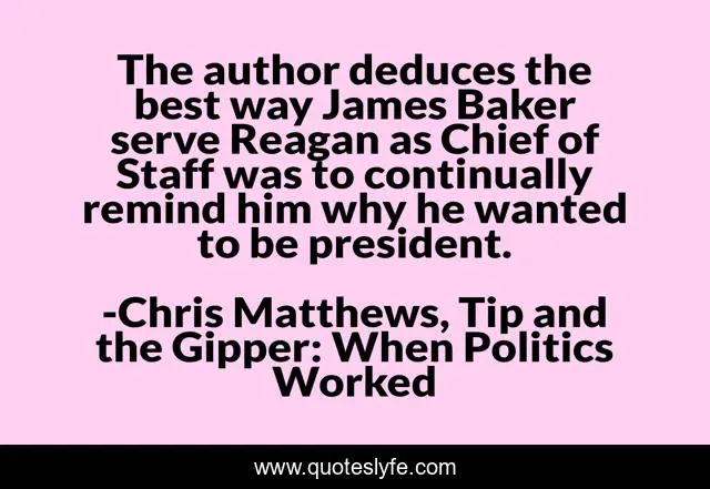 This page presents the quote "The author deduces the best way James Baker serve Reagan as Chief of Staff was to continually remind him why he wanted to be president.". Author of this quote is Chris Matthews, Tip and the Gipper: When Politics Worked. This quote is about motivation, focus, inspiration,.