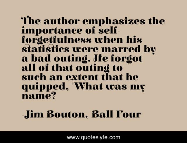 This page presents the quote "The author emphasizes the importance of self-forgetfulness when his statistics were marred by a bad outing. He forgot all of that outing to such an extent that he quipped, "What was my name?". Author of this quote is Jim Bouton, Ball Four. This quote is about discipleship, repentance, perspective, humility,.
