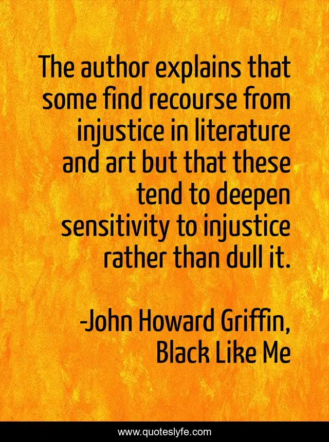 This page presents the quote "The author explains that some find recourse from injustice in literature and art but that these tend to deepen sensitivity to injustice rather than dull it.". Author of this quote is John Howard Griffin, Black Like Me. This quote is about idealism, education, perspective,.