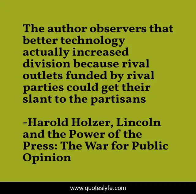 This page presents the quote "The author observers that better technology actually increased division because rival outlets funded by rival parties could get their slant to the partisans". Author of this quote is Harold Holzer, Lincoln and the Power of the Press: The War for Public Opinion. This quote is about partisanship, polarization, unity, bias,.