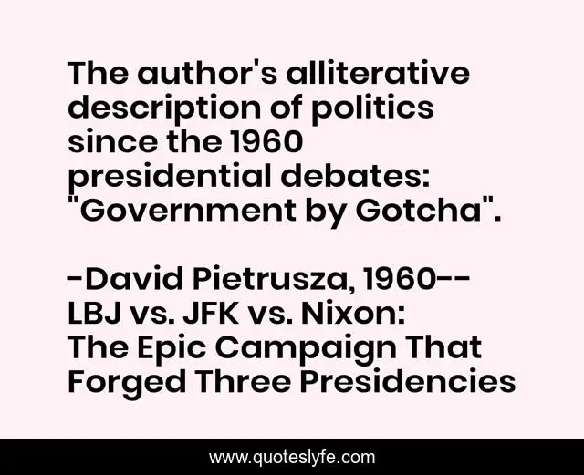 This page presents the quote "The author's alliterative description of politics since the 1960 presidential debates: "Government by Gotcha".". Author of this quote is David Pietrusza, 1960--LBJ vs. JFK vs. Nixon: The Epic Campaign That Forged Three Presidencies. This quote is about division, rhetoric, leadership,.