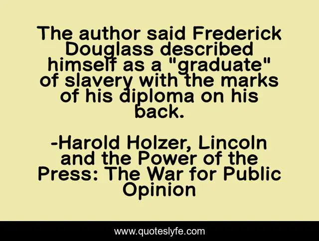 This page presents the quote "The author said Frederick Douglass described himself as a "graduate" of slavery with the marks of his diploma on his back.". Author of this quote is Harold Holzer, Lincoln and the Power of the Press: The War for Public Opinion. This quote is about maturation, suffering, education,.
