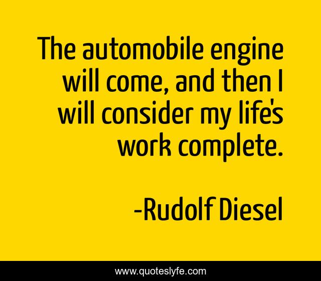 This page presents the quote "The automobile engine will come, and then I will consider my life's work complete.". Author of this quote is Rudolf Diesel. This quote is about car, life, automobile,.