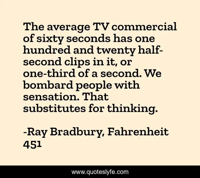 "Ray Bradbury, Fahrenheit 451 Quotes." Quoteslyfe.com, 2025. Mon. 08 Dec. 2025. <https://www.quoteslyfe.com/quote/The-average-TV-commercial-of-sixty-seconds-233549>.