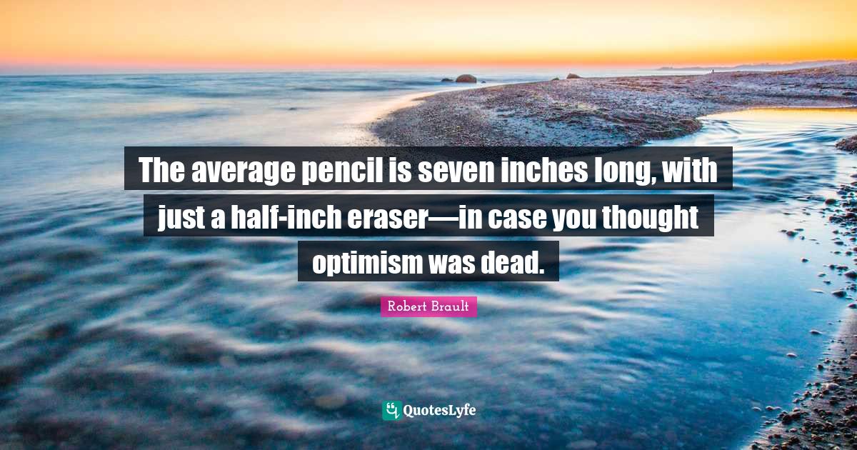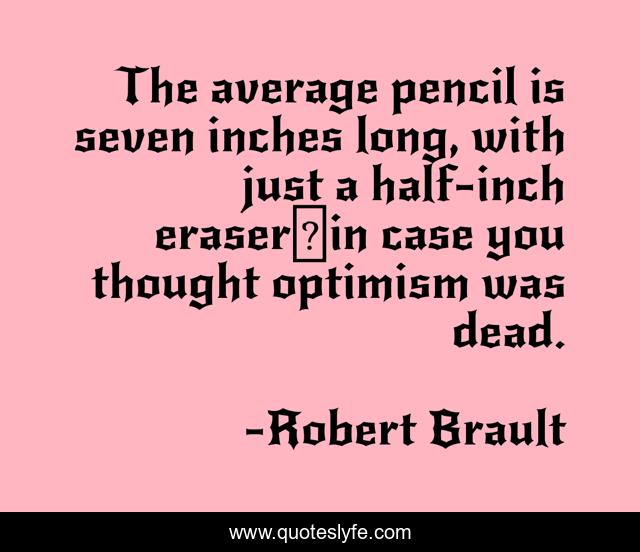 This page presents the quote "The average pencil is seven inches long, with just a half-inch eraser―in case you thought optimism was dead.". Author of this quote is Robert Brault. This quote is about optimism, writing,.